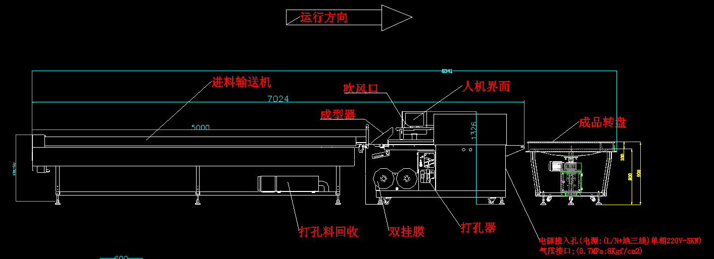 操作流程:人工在工作臺把蔬菜放入輸入輸送機-》葉菜包裝機完成自動打孔-》自動裹膜è廢料收集-》制袋成型-》橫封封切-》成品輸出-》進入旋轉(zhuǎn)接料盤